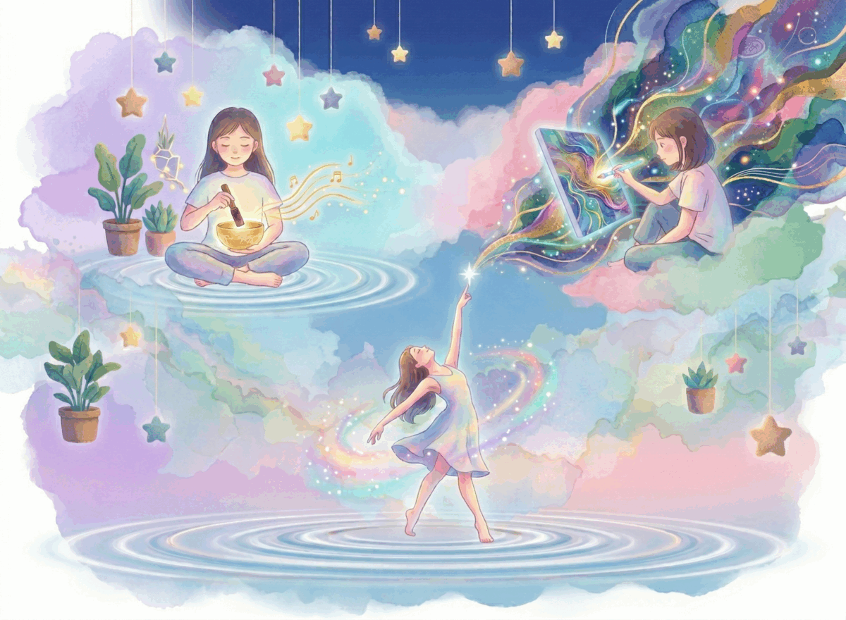 動夠了、鬆透了,我們再拿起畫筆。這時候的創作,不是為了畫得像什麼,而是為了記錄剛才那場身體與靈魂的雙人舞。色彩在紙上流動的樣子,就是你恢復平衡的最佳證明。